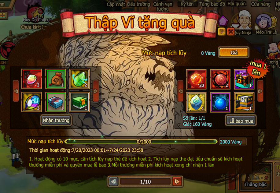 1. Hoạt động có 10 mục, cần tích lũy nạp thẻ để kích hoạt.