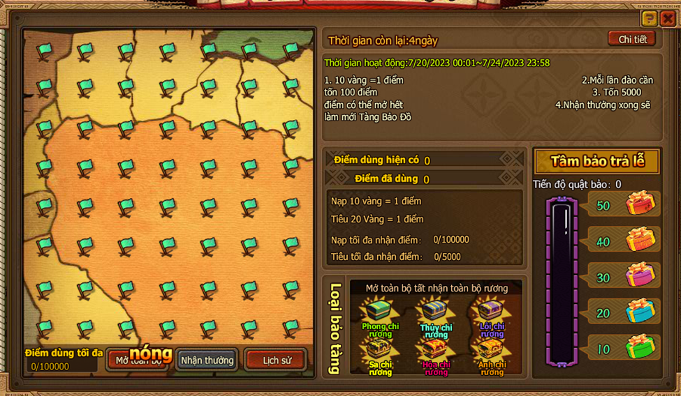 2. Dùng Tàng Bảo Đồ tiến hành mini game Quật Bảo (Tàng Bảo Đồ không đủ dùng Vàng bù đầy, 1 Tàng Bảo Đồ = 50 Vàng).