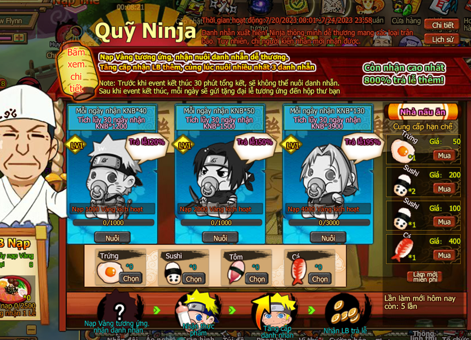 2. Tổng có 3 loại quỹ vàng ,mỗi loại trả lễ khác nhau , có thể nuôi 3 ninja