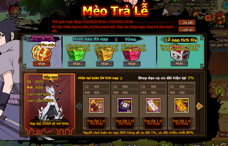 1. Người chơi nạp vàng , kích hoạt quỹ ninja : kích hoạt naruto cần nạp 2500 vàng , kích hoạt sasuke cần nạp 5000 vàng , kích hoạt sakura cần nạp 10000 vàng