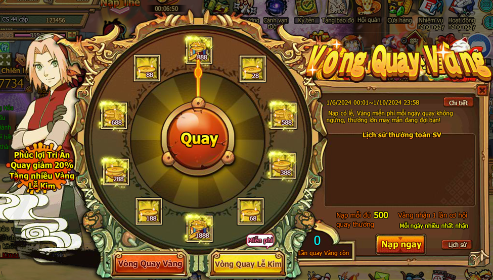 1. Trong thời gian event , người chơi nạp đủ 500 vàng nhận 1 lần cơ hội quay (vòng quay vàng)