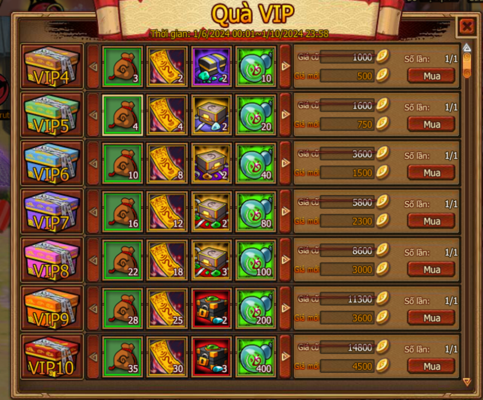 Cấp vip tương ứng sẽ được mua , mua bằng vàng hoặc lễ kim