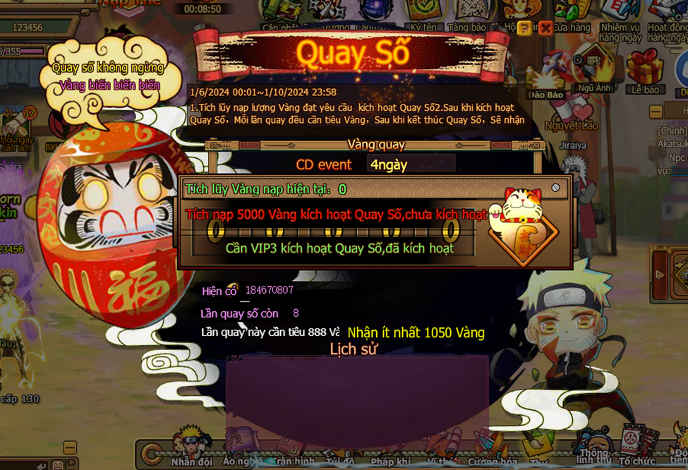 3. Trong thời gian event , người chơi tiêu đủ 1000 vàng nhận 1 lần cơ hội vòng quay lễ kim , mỗi ngày nhiều nhất có thể nhận 20 lần
