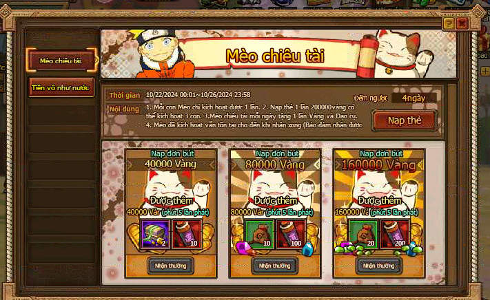 3. Mèo chiêu tài mỗi ngày tặng 1 lần Vàng và đạo cụ.