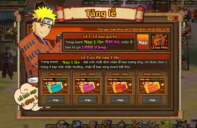 Trong thời gian event nạp 1 lần đạt mức chỉ định , nhận trả lễ vàng