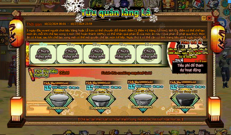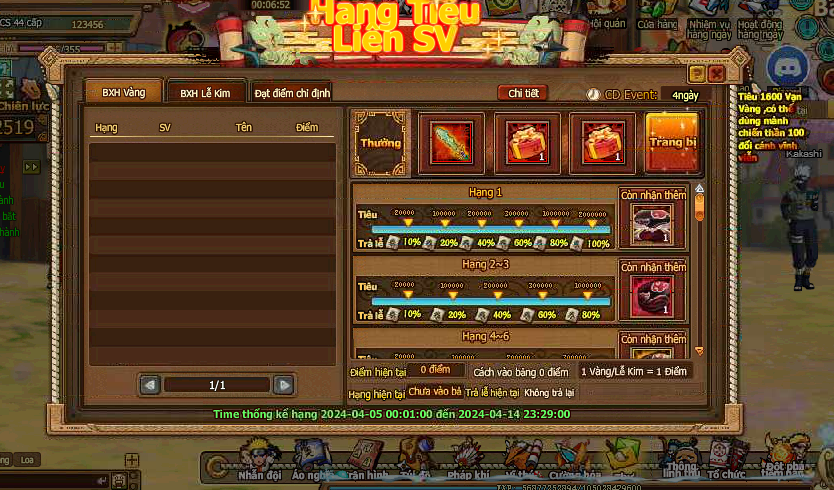 1. 5 ngày đầu event người chơi tiêu Vàng hoặc Lễ Kim có thể chuyển đổi thanh điểm ( 1 điểm = 1 vàng / lễ kim )