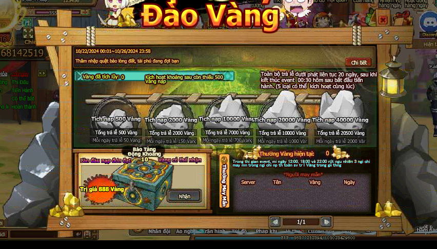 5. Trong thời gian event , nạp 1 lần đầu tiên thỏa nhận thêm bảo tàng khoáng . Trong thời gian , thống kê mức nạp của người chơi toan sv đến giải thưởng may mắn , Mổi nạp 1 Vàng giải thưởng tăng 1 Vàng , mỗi ngày 12:00, 18:00, 22:00 rút ngẫu nhiên 3 người chơi may mắn trong người chơi nạp thẻ toàn sv trả lễ Vàng