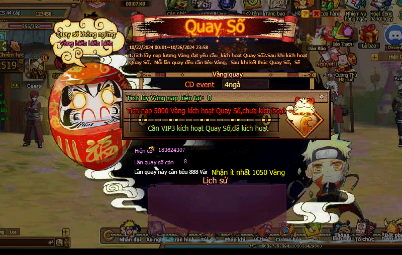 2. Sau khi kích hoạt Quay Số, Mỗi lần quay đều cần tiêu Vàng, sau khi kết thúc Quay Số, sẽ nhận Vàng trả