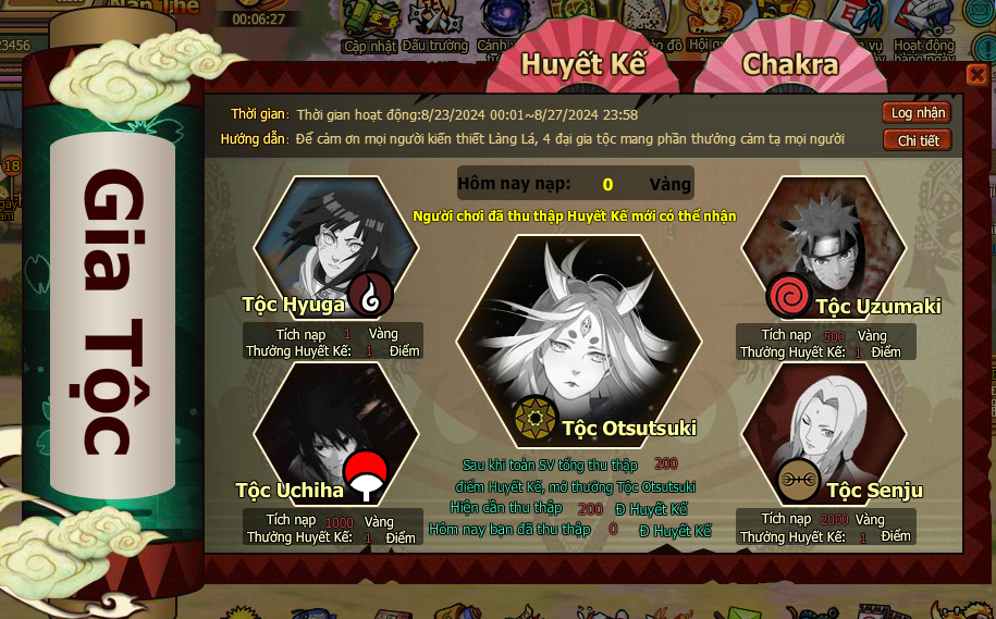 1. Trong thời gian hoạt động mỗi ngày tích lũy nạp đủ mốc tương ứng, mở 4 đại gia tộc, nhận thưởng Huyết kế tương ứng. 4 đại gia tộc gồm: Tộc Hyuga, Tộc Uzumaki, Tộc Uchiha, Tộc Senju.
