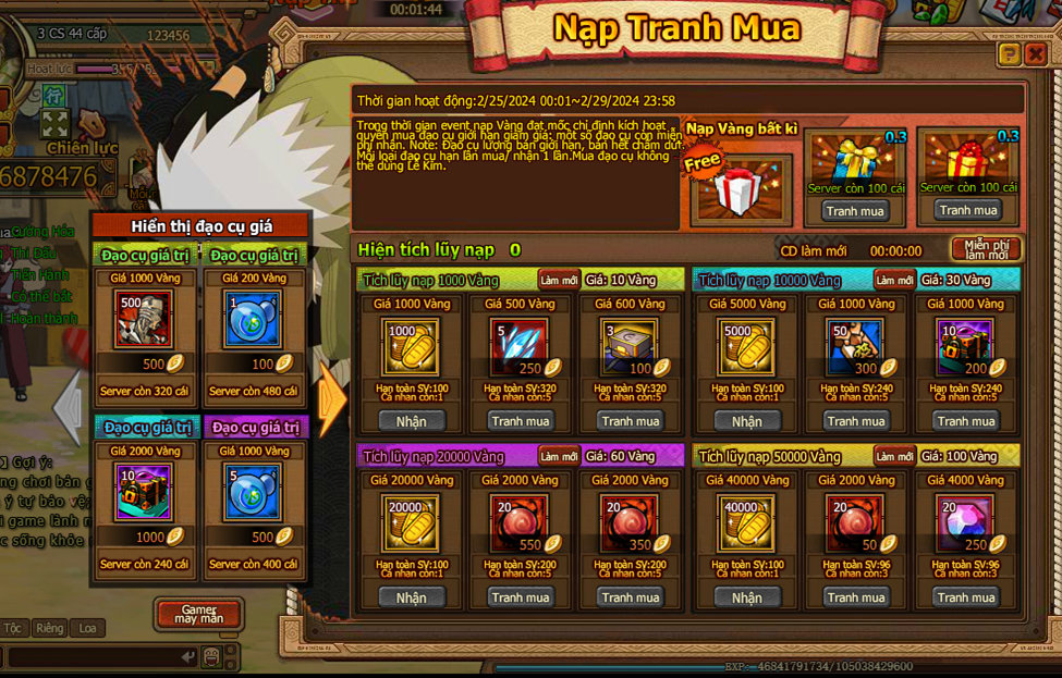 1. Trong thời gian event nạp Vàng đạt mốc chỉ định kích hoạt quyền mua đạo cụ giới hạn giảm giá: một số đạo cụ còn miễn phí nhận.