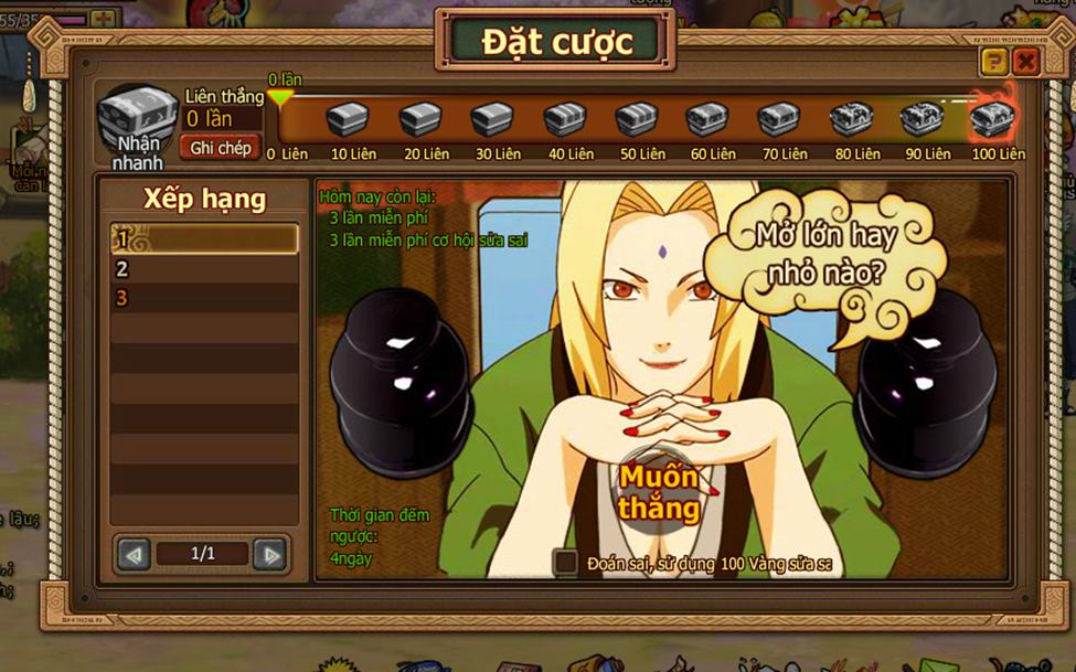 2. Thi đấu bắt đầu khi người chơi điểm số mình lớn hơn hay nhở hơn điểm của Tsunade, nhấn vào nút Lớn hoặc Nhỏ.