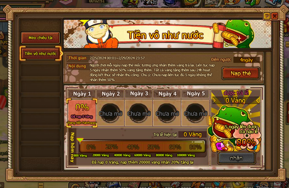1. Người chơi mỗi ngày nạp thẻ mốc tương ứng nhận thêm vàng trả lại. Liên tục nạp 5 ngày nhận thêm 80% vàng tặng thêm. Tất cả vàng tặng thêm sau 24h hoạt động kết thúc sẽ nhận thủ công. Chú ý: Chưa nạp liên tục đủ 5 ngày không thể nhận thêm 80%.