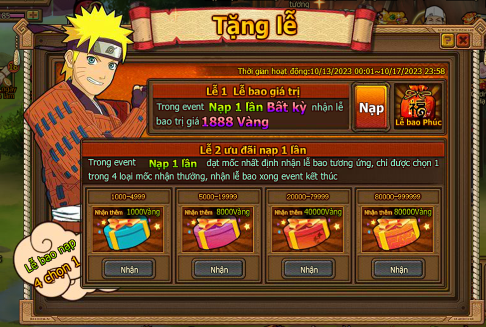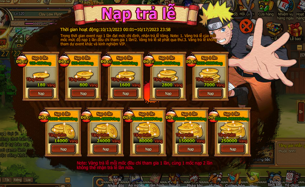 Trong thời gian event nạp 1 lần đạt mức chỉ định , nhận trả lễ vàng .