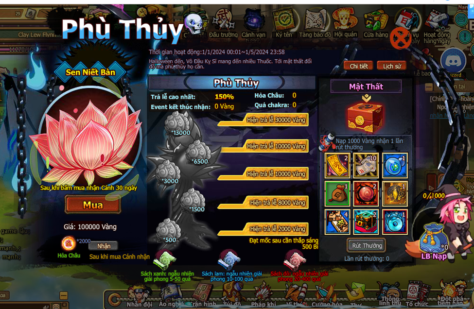 1. Người chơi nạp vàng , kích hoạt quỹ ninja : kích hoạt naruto cần nạp 2500 vàng , kích hoạt sasuke cần nạp 5000 vàng , kích hoạt sakura cần nạp 10000 vàng