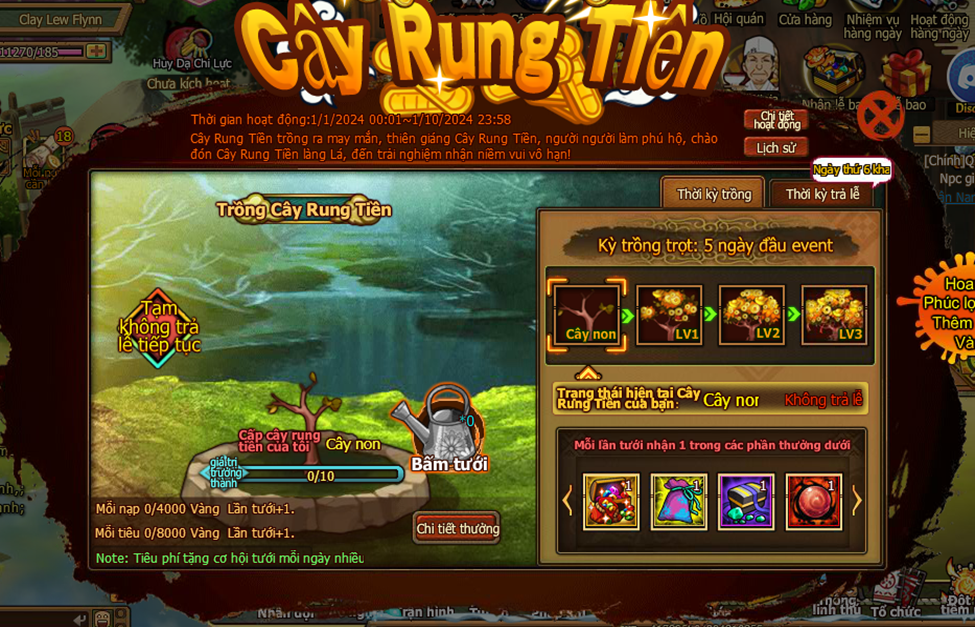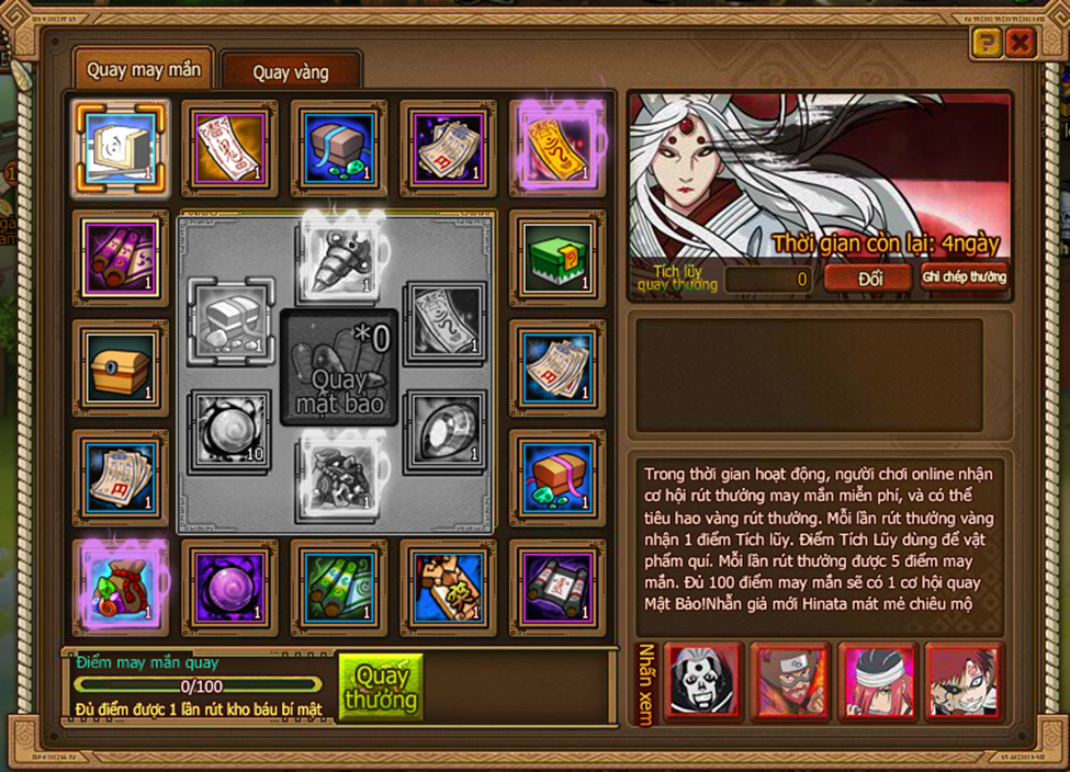 Trong thời gian hoạt động, người chơi online nhận cơ hội rút thưởng may mắn miễn phí, và có thể tiêu hao vàng và lễ kim rút thưởng. Mỗi lần rút thưởng vàng nhận 1 điểm tích lũy. Điểm Tích Lũy dùng để vật phẩm quý. Mỗi lần rút thưởng được 5 điểm may mắn. Đủ 100 điểm may mắn sẽ có 1 cơ hội quay Mật Bảo