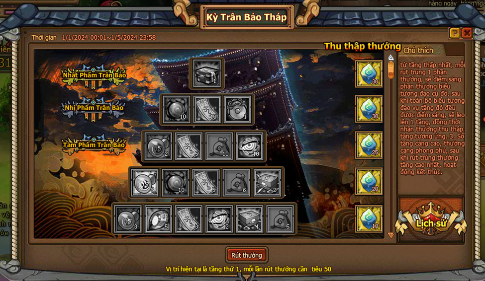 1. Từ tầng thấp nhất, mỗi rút trúng 1 phần thưởng, sẽ điểm sáng phần thưởng biểu tượng đạo cụ đó đều được điểm sáng, sẽ leo lên 1 tầng, đồng thời nhận thưởng thu thập tầng tương ứng.