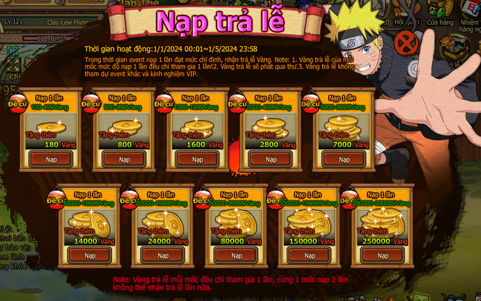 Trong thời gian event nạp 1 lần đạt mức chỉ định , nhận trả lễ vàng .