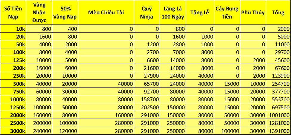 3. Ninja cuôi cấp càng cao , vàng trả lễ càng nhiều