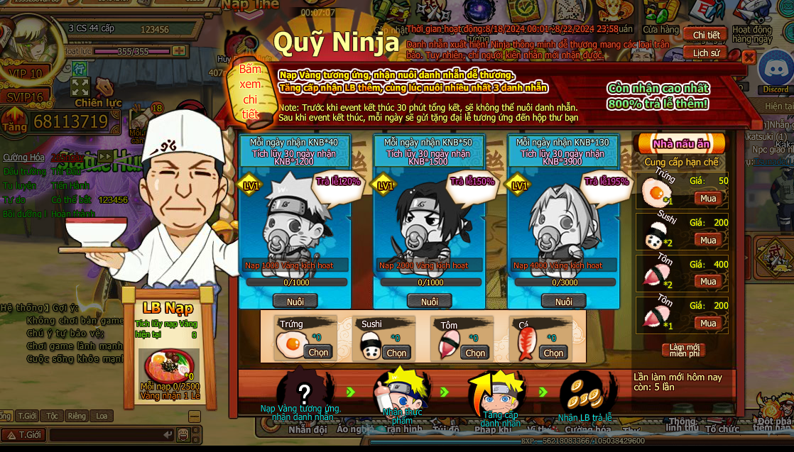 1. Người chơi nạp vàng , kích hoạt quỹ ninja : kích hoạt naruto cần nạp 1000 vàng , kích hoạt sasuke cần nạp 2000 vàng , kích hoạt sakura cần nạp 4000 vàng