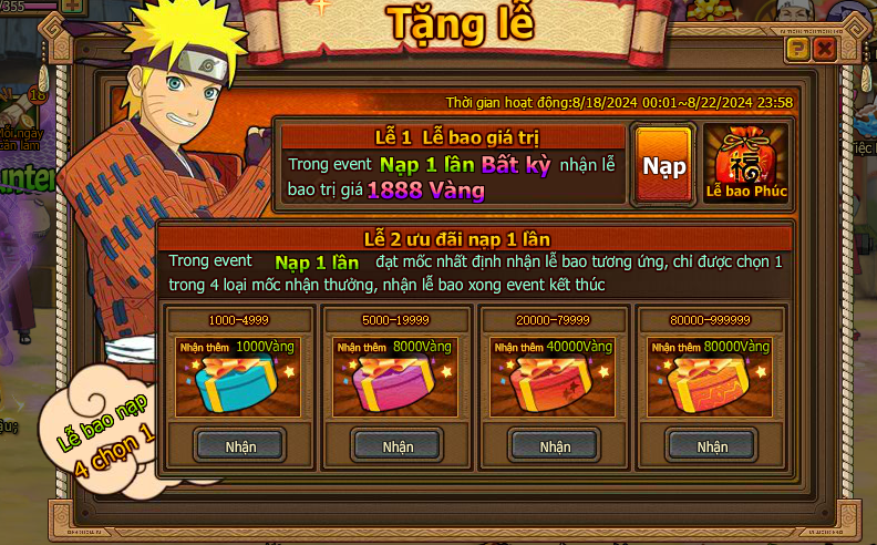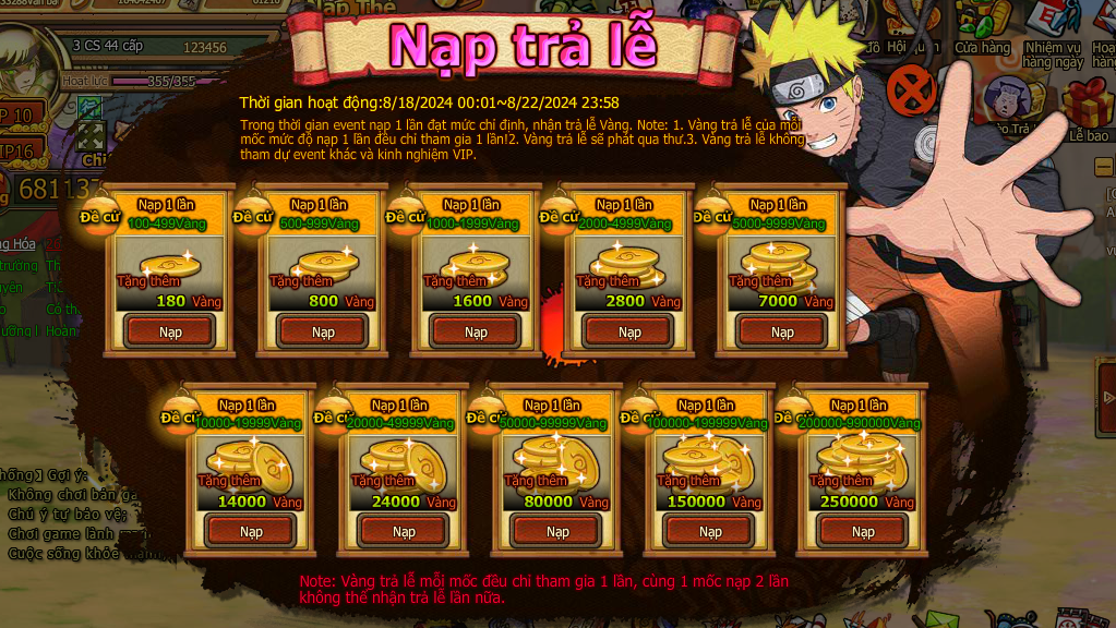 Trong thời gian event nạp 1 lần đạt mức chỉ định , nhận trả lễ vàng