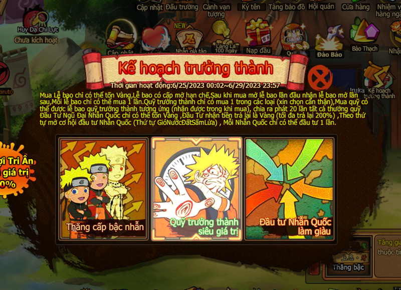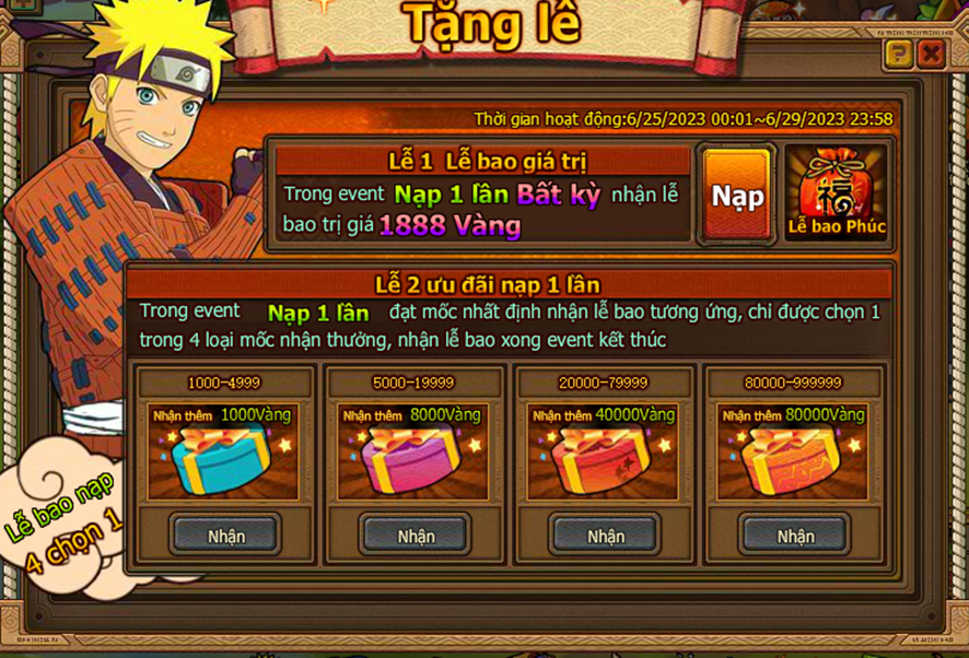 Trong thời gian event nạp 1 lần đạt mức chỉ định , nhận trả lễ vàng.