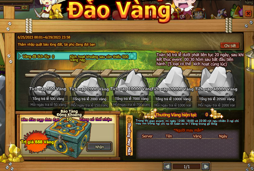 5. Trong thời gian event , nạp 1 lần đầu tiên thỏa nhận thêm bảo tàng khoáng . Trong thời gian , thống kê mức nạp của người chơi toan sv đến giải thưởng may mắn , Mổi nạp 1 Vàng giải thưởng tăng 1 Vàng , mỗi ngày 12:00, 18:00, 22:00 rút ngẫu nhiên 3 người chơi may mắn trong người chơi nạp thẻ toàn sv trả lễ Vàng