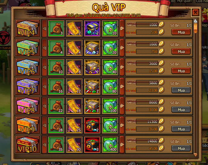 Cấp vip tương ứng sẽ được mua , mua bằng vàng hoặc lễ kim