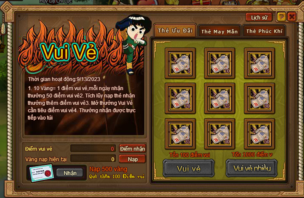1. Người chơi nạp vàng , kích hoạt quỹ ninja : kích hoạt naruto cần nạp 2500 vàng , kích hoạt sasuke cần nạp 5000 vàng , kích hoạt sakura cần nạp 10000 vàng