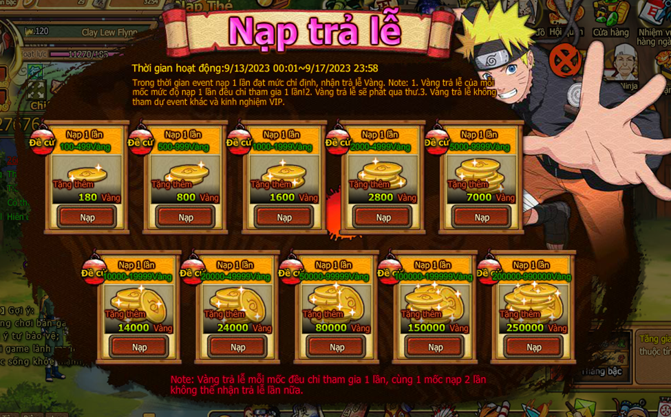 Trong thời gian event nạp 1 lần đạt mức chỉ định , nhận trả lễ vàng .