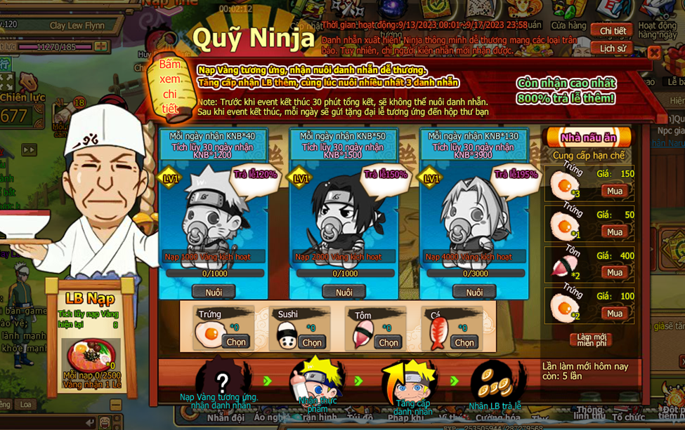 2. Tổng có 3 loại quỹ vàng ,mỗi loại trả lễ khác nhau , có thể nuôi 3 ninja