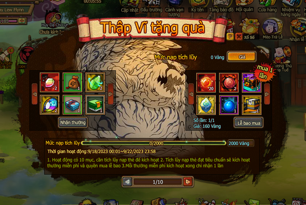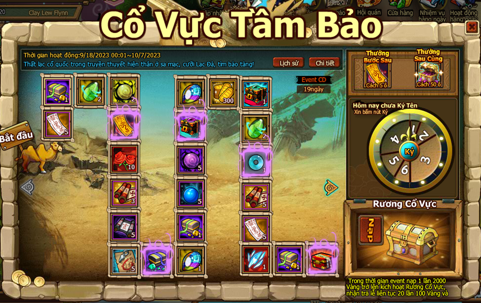 Trong thời gian sự kiện nạp 1 lần 2000 Vàng trở lên kích hoạt Rương Cổ Vực, nhận trả lễ liên tcj 20 lần 100 Vàng và đạo cụ.