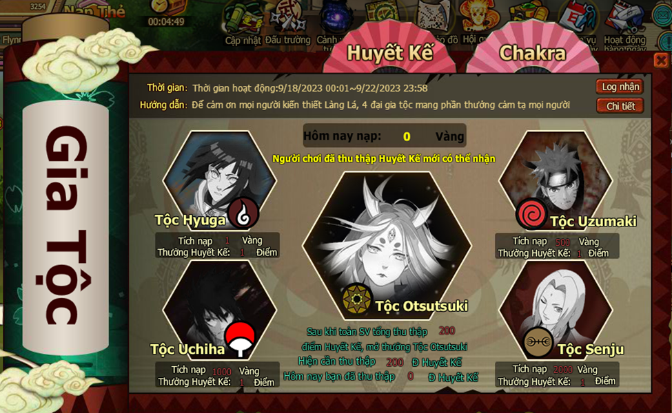 1. Trong thời gian hoạt động mỗi ngày tích lũy nạp đủ mốc tương ứng, mở 4 đại gia tộc, nhận thưởng Huyết kế tương ứng. 4 đại gia tộc gồm: Tộc Hyuga, Tộc Uzumaki, Tộc Uchiha, Tộc Senju.