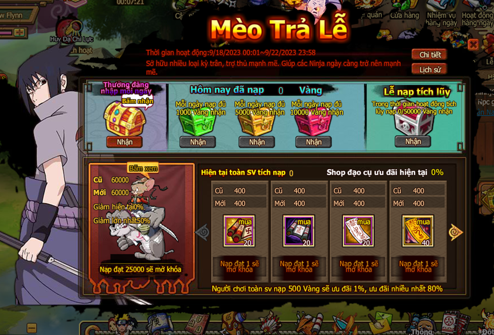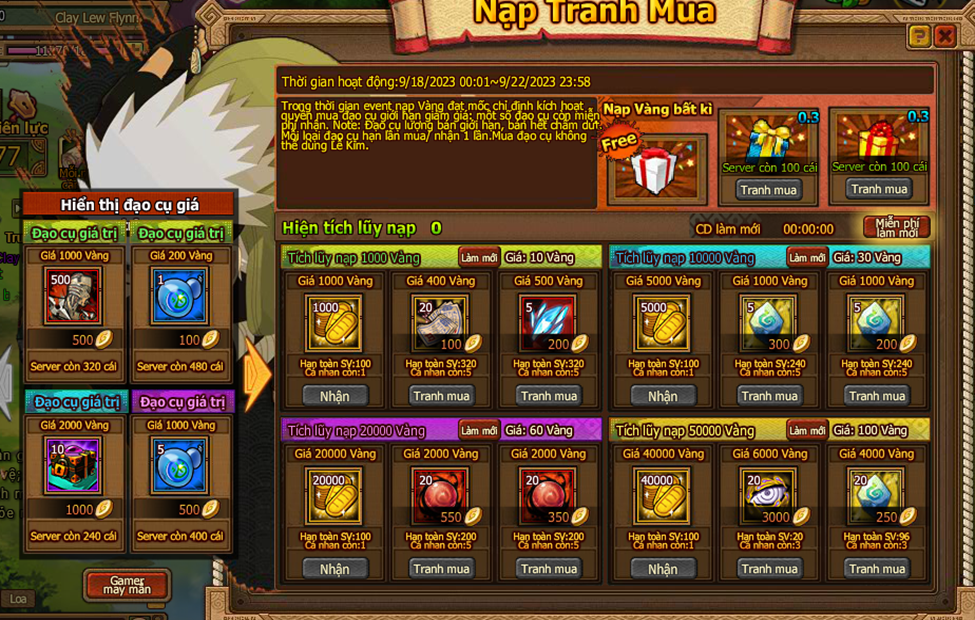 1. Trong thời gian event nạp Vàng đạt mốc chỉ định kích hoạt quyền mua đạo cụ giới hạn giảm giá: một số đạo cụ còn miễn phí nhận.