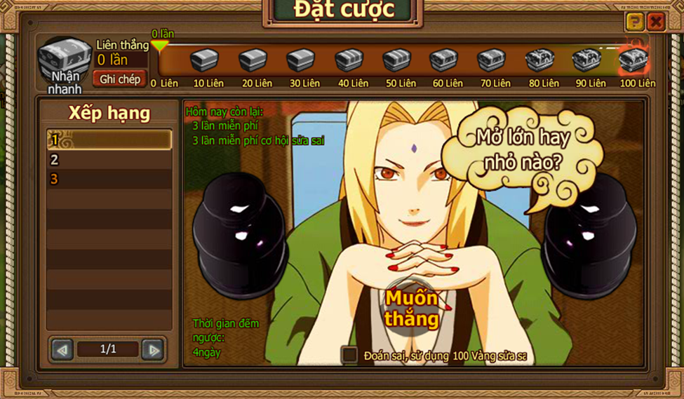 2. Thi đấu bắt đầu khi người chơi điểm số mình lớn hơn hay nhở hơn điểm của Tsunade, nhấn vào nút Lớn hoặc Nhỏ.