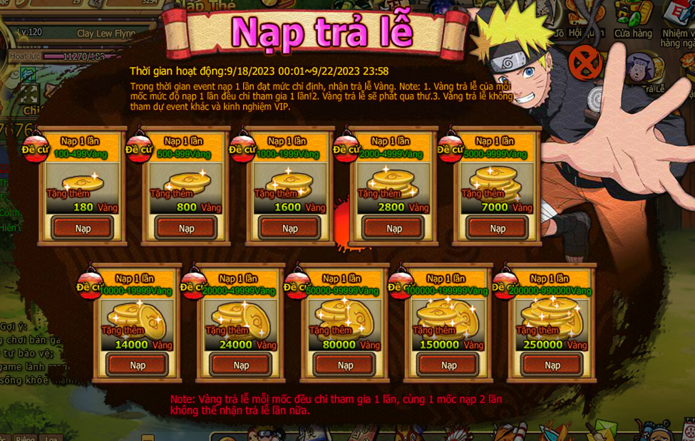 Trong thời gian event nạp 1 lần đạt mức chỉ định , nhận trả lễ vàng .