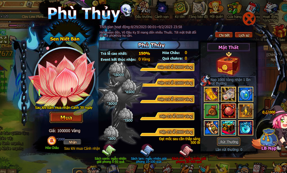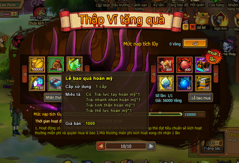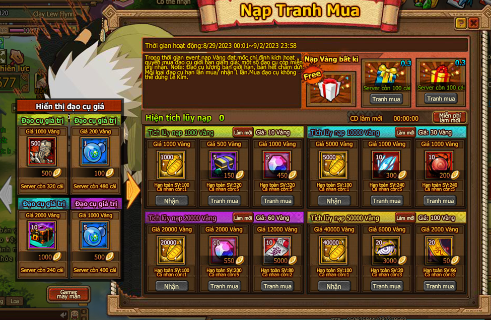 1. Trong thời gian event nạp Vàng đạt mốc chỉ định kích hoạt quyền mua đạo cụ giới hạn giảm giá: một số đạo cụ còn miễn phí nhận.