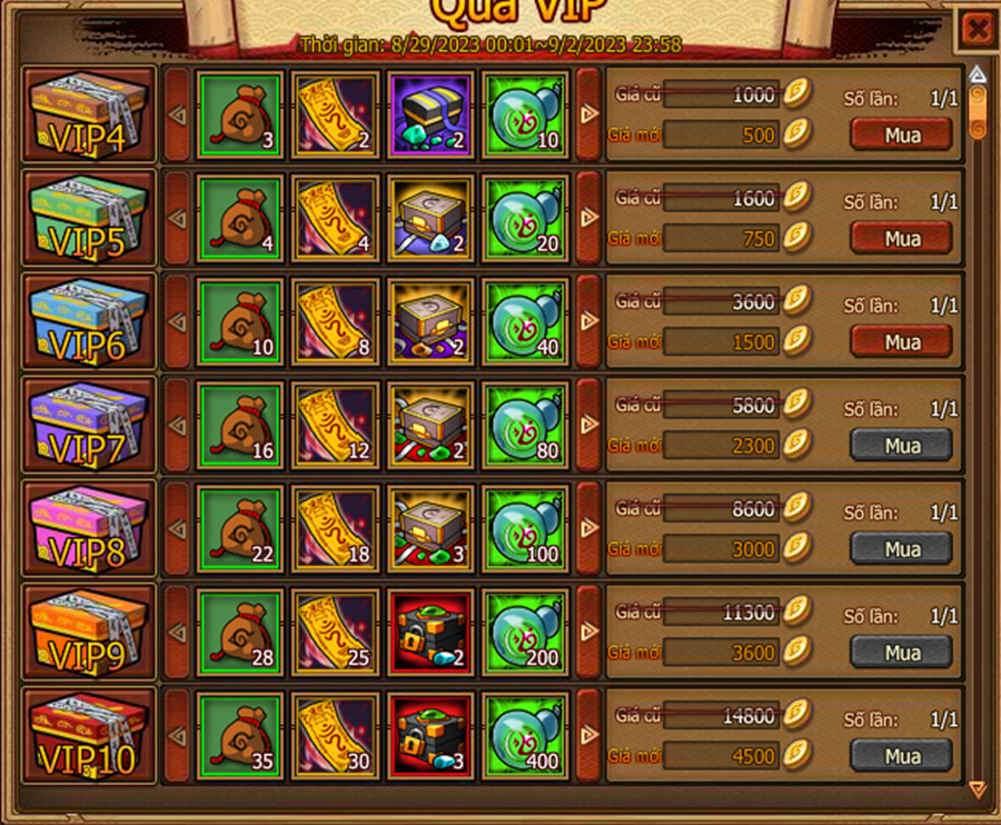 Cấp vip tương ứng sẽ được mua , mua bằng vàng hoặc lễ kim