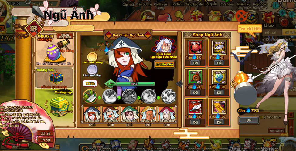 7. ở [Shop Ngũ Ảnh] tiêu [Tinh hồn] đổi các loại đạo cụ, và Ninja mới [Hotaru] đợi bạn chiêu mộ.