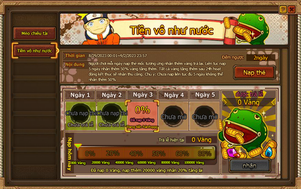 1. Người chơi mỗi ngày nạp thẻ mốc tương ứng nhận thêm vàng trả lại. Liên tục nạp 5 ngày nhận thêm 80% vàng tặng thêm. Tất cả vàng tặng thêm sau 24h hoạt động kết thúc sẽ nhận thủ công. Chú ý: Chưa nạp liên tục đủ 5 ngày không thể nhận thêm 80%.