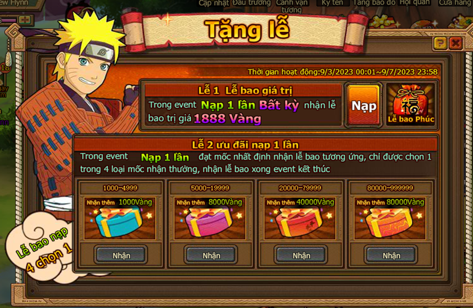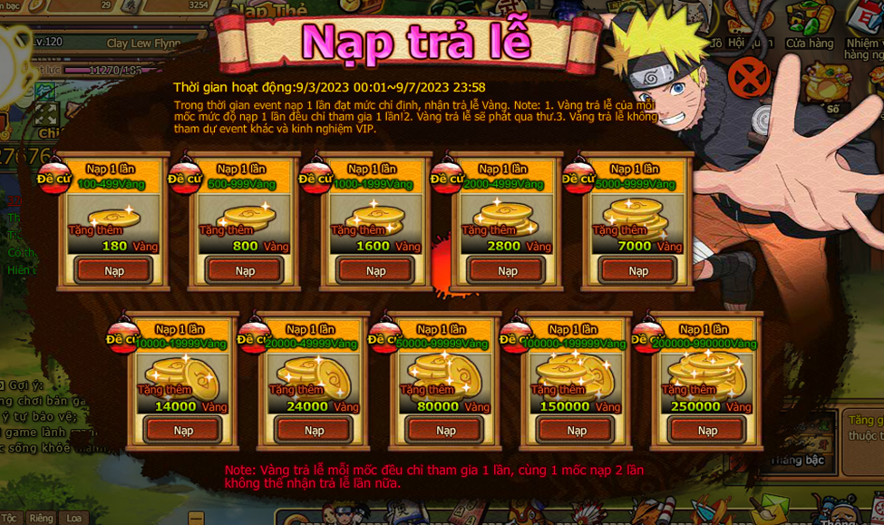 Trong thời gian event nạp 1 lần đạt mức chỉ định , nhận trả lễ vàng .