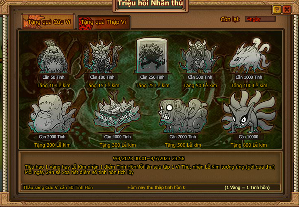 4. Tiêu hao 1 vàng/ lễ kim nhận tinh hồn , thu thập đủ điều kiện nhận rương quà qua thư