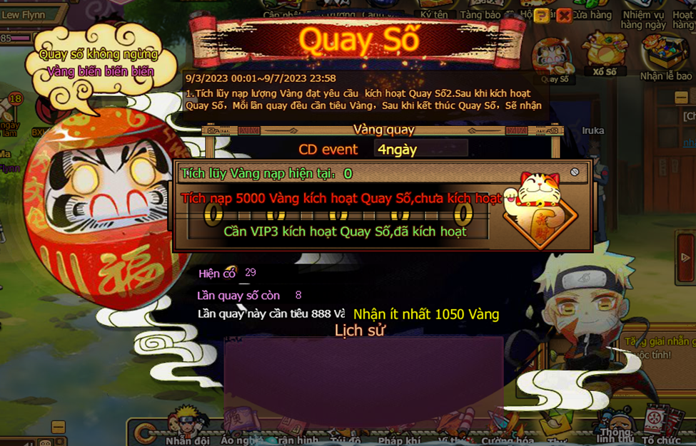 3. Trong thời gian event , người chơi tiêu đủ 1000 vàng nhận 1 lần cơ hội vòng quay lễ kim , mỗi ngày nhiều nhất có thể nhận 20 lần
