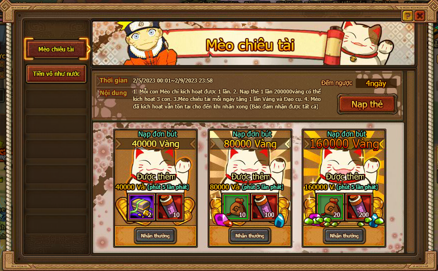 3. Mèo chiêu tài mỗi ngày tặng 1 lần Vàng và đạo cụ.