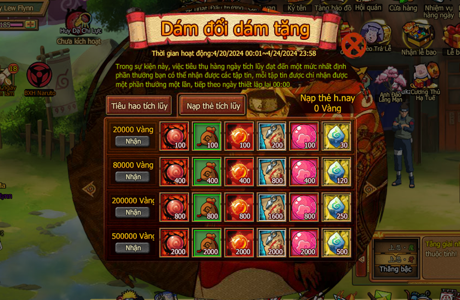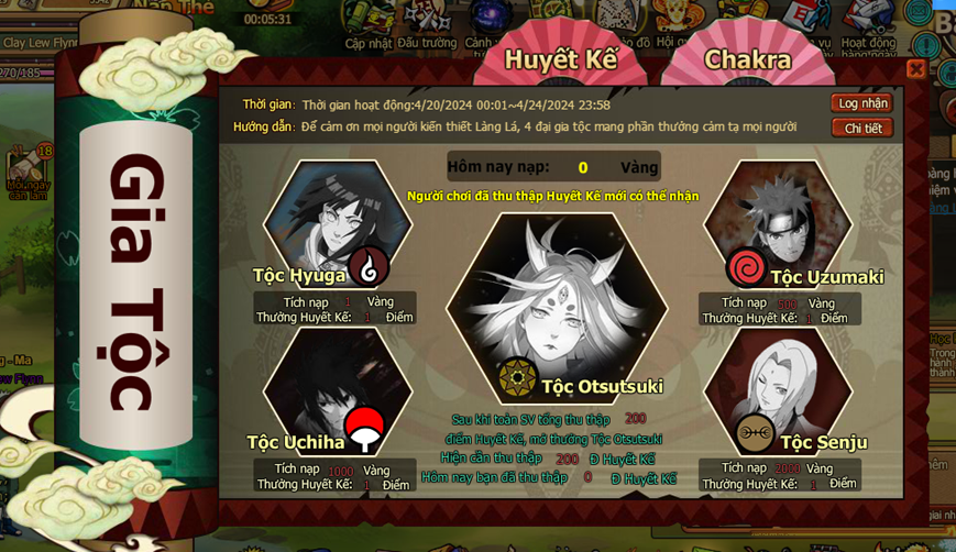 1. Trong thời gian hoạt động mỗi ngày tích lũy nạp đủ mốc tương ứng, mở 4 đại gia tộc, nhận thưởng Huyết kế tương ứng. 4 đại gia tộc gồm: Tộc Hyuga, Tộc Uzumaki, Tộc Uchiha, Tộc Senju.