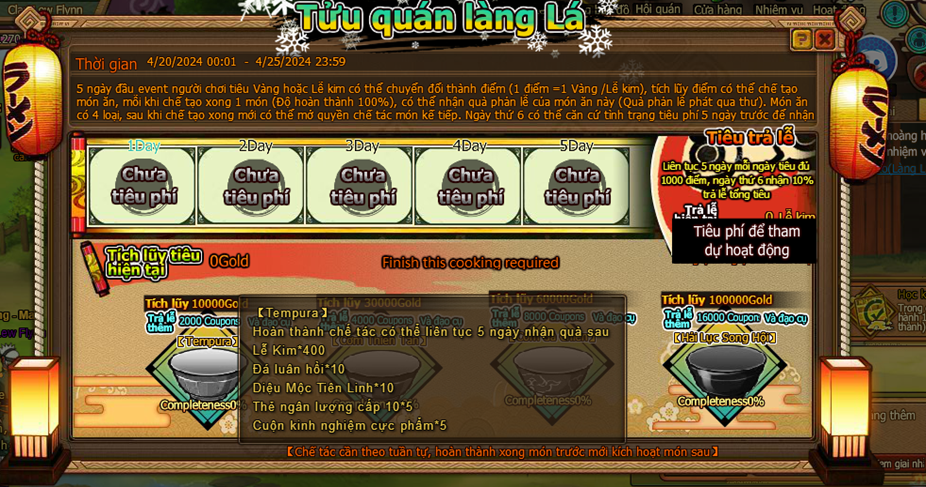 1. 5 ngày đầu event người chơi tiêu Vàng hoặc Lễ Kim có thể chuyển đổi thanh điểm ( 1 điểm = 1 vàng / lễ kim )