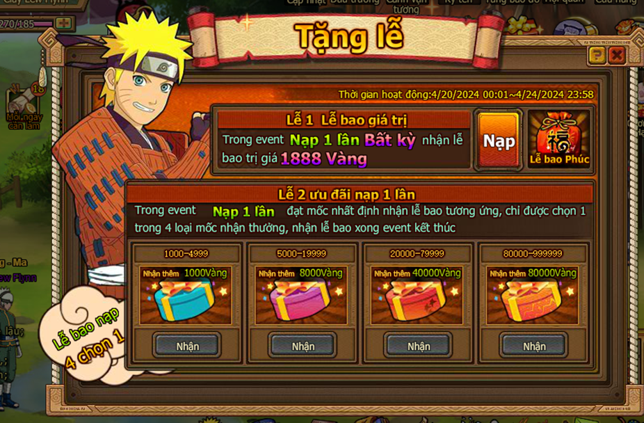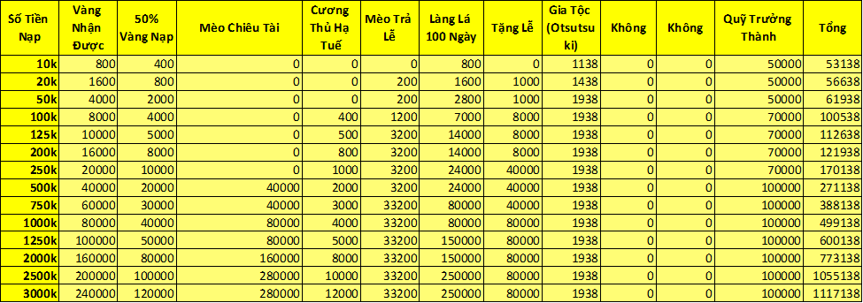 Trong thời gian event nạp 1 lần đạt mức chỉ định , nhận trả lễ vàng