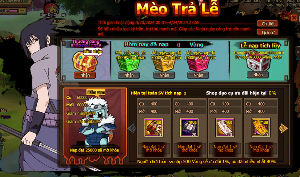 2. Sau khi nạp đủ mốc tương ứng, nhận thưởng Tộc Otsutsuki, nếu chưa nhận thưởng, không thể tăng số lượng Huyết Kế.