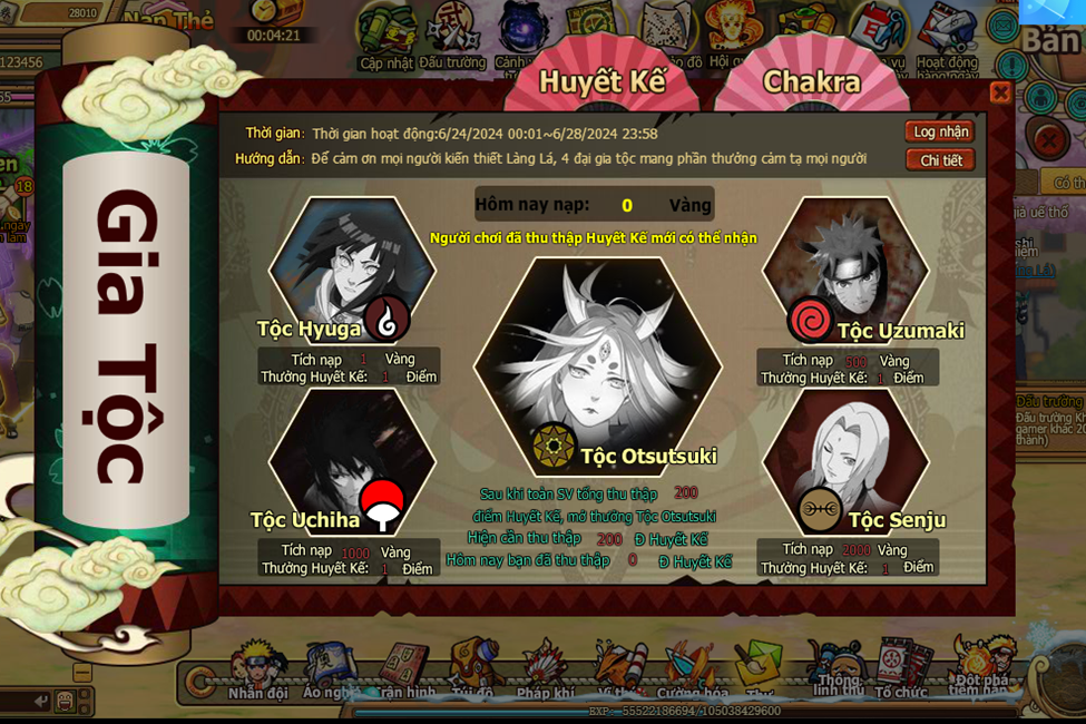 1. Trong thời gian hoạt động mỗi ngày tích lũy nạp đủ mốc tương ứng, mở 4 đại gia tộc, nhận thưởng Huyết kế tương ứng. 4 đại gia tộc gồm: Tộc Hyuga, Tộc Uzumaki, Tộc Uchiha, Tộc Senju.