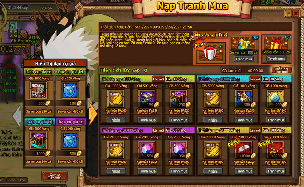 1. Trong thời gian event nạp Vàng đạt mốc chỉ định kích hoạt quyền mua đạo cụ giới hạn giảm giá: một số đạo cụ còn miễn phí nhận.
