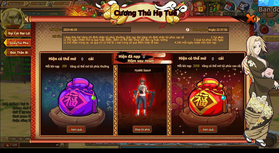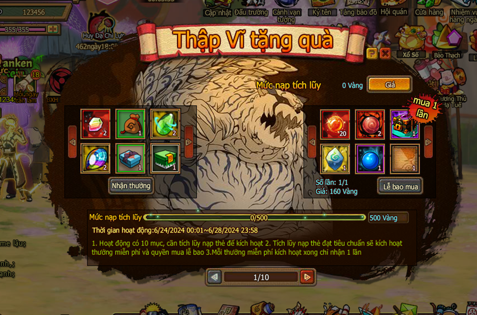 2. Sau khi nạp đủ mốc tương ứng, nhận thưởng Tộc Otsutsuki, nếu chưa nhận thưởng, không thể tăng số lượng Huyết Kế.